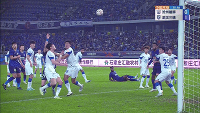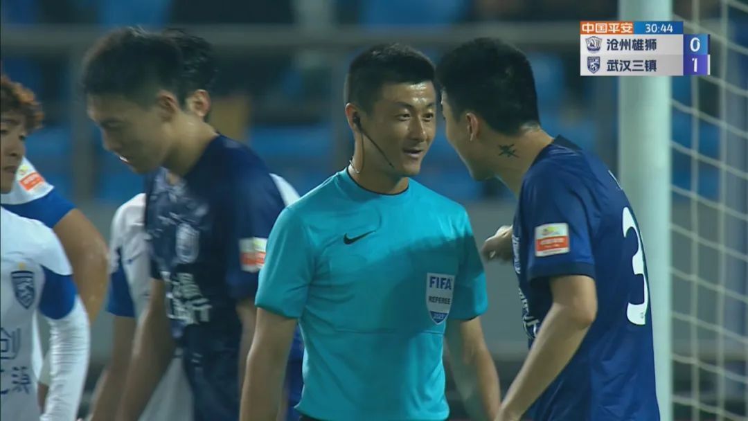 争议判罚:比赛第 31 分钟,沧州雄狮开出角球,武汉三镇的防守球员高准翼在解围时将球踢到了自己的手臂上,沧州雄狮球员纷纷向主裁判投诉出现疑似手球,但傅明并未做出点球判罚。
