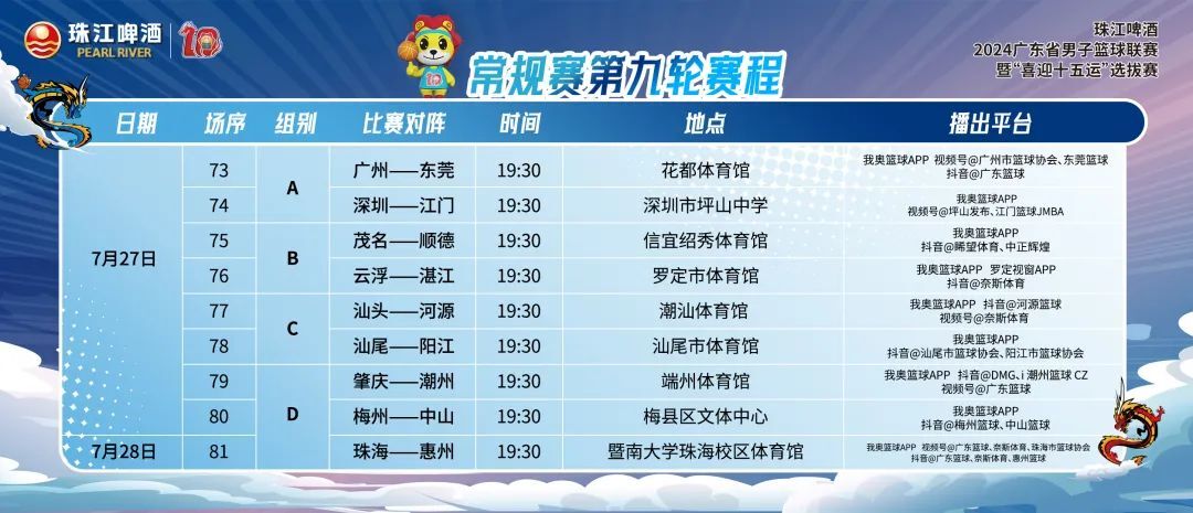 珠江啤酒·2024广东省男子篮球联赛暨“喜迎十五运”选拔赛常规赛第九轮本周末即将上演。本轮共9场比赛,有8场比赛将于本周六(7月27日)晚19:30进行,珠海与惠州的比赛将于本周日(7月28日)晚19:30打响。