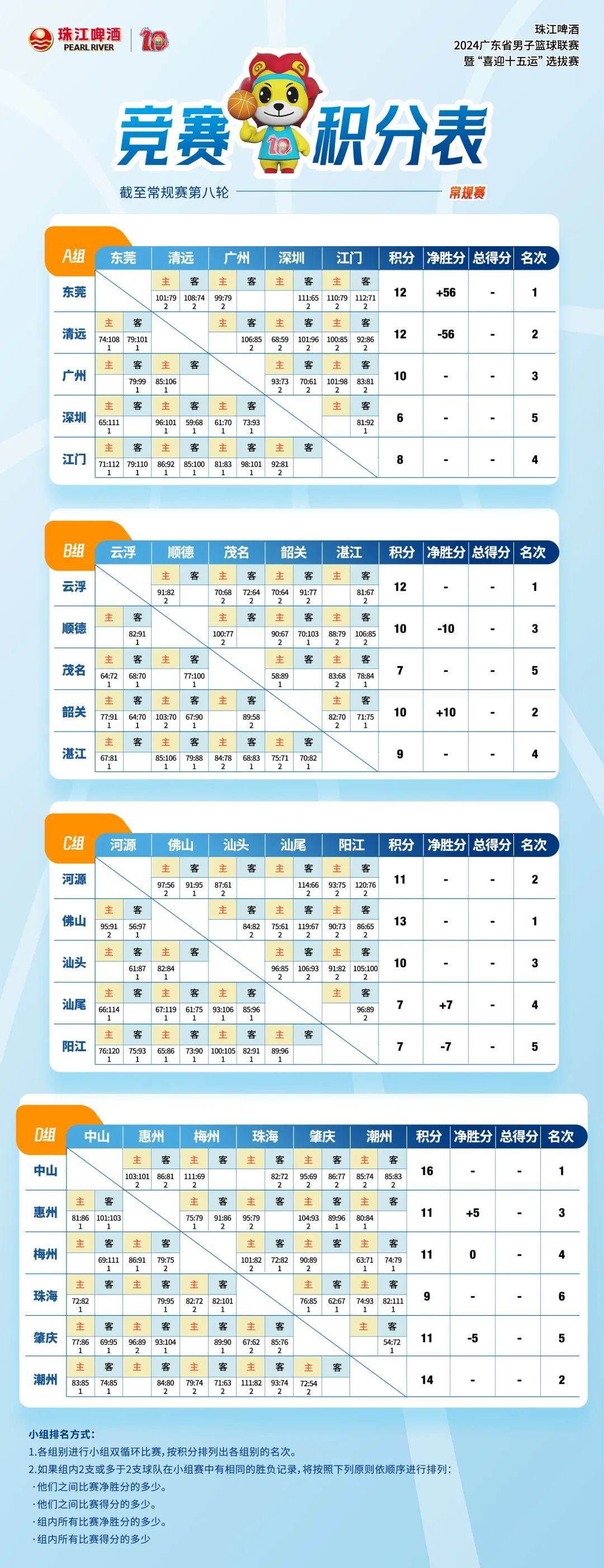 常规赛进入倒数第二轮,中山锁定八强名额以赛练兵。分列A、B组头名的东莞和云浮只需一场胜利就能提前锁定小组第一,闯入八强。河源乘胜追击力争小组头名,仍有晋级希望的其他各队将为小组名次落位全力冲刺。
