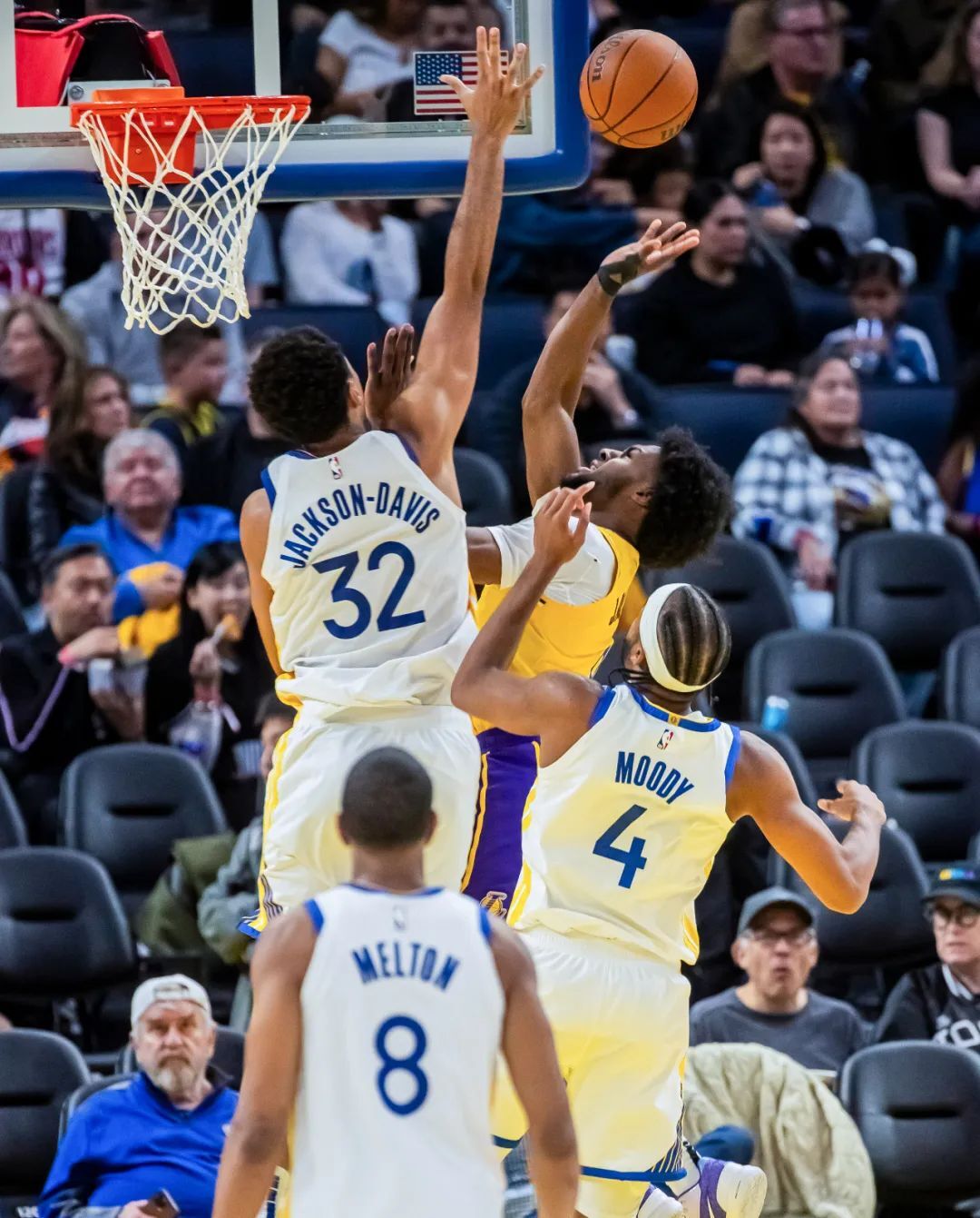 二年级球员特雷斯·杰克逊-戴维斯在大胜湖人的比赛表现抢眼,他9投6中,得到12分1篮板5助攻4盖帽。勇士主帅科尔很可能在新赛季用他出任首发中锋,到时候球队使用高个阵容——库里、维金斯、库明加、追梦和戴维斯。
