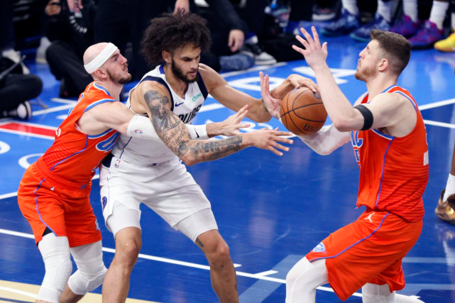 逼迫对手失误和降低对手命中率,这两件事在联盟里大多数时候很难同时完成。一旦你防得激进,你总会有被漂亮的传球打穿的时候。如果你不想给对面好的出手机会而防得保守,那对手的失误和你的抢断数一定高不到哪儿去。但雷霆不是普通的防守球队,东契奇在这场比赛里面对的也不是一条普通的防线,而是一群极富侵略性的狼。我们可以顺着看一看雷霆这帮侧翼和后卫的名字:谢伊·吉尔吉斯-亚历山大、杰伦·威廉姆斯、吕兹冈·多尔特、阿莱克斯·卡鲁索、卡森·华莱士、阿伦·威金斯和以赛亚·乔。