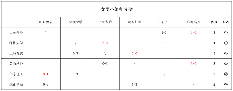 与山东鲁能、华东理工大学一样取得1胜1负战绩的还有上海龙腾,至于成都高新若水居则是2战全部告负,无奈成为积分排名垫底的队伍。