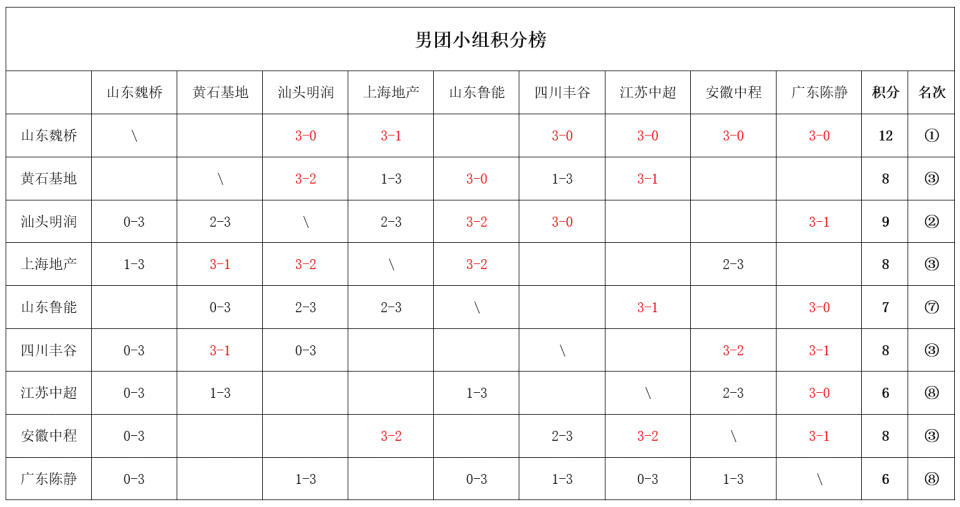 男团积分榜排第二的汕头明润3胜3负,林高远9次出场赢下7次,堪称最佳劳模;上海地产集团、黄石基地·华新、四川丰谷、安徽中程单招基地均为3胜2负,其中上海的樊振东实现单打7连胜;山东鲁能2胜3负;江苏中超电缆·迎福台1胜4负、先锋乒羽陈静俱乐部0胜6负,两队积分相同。