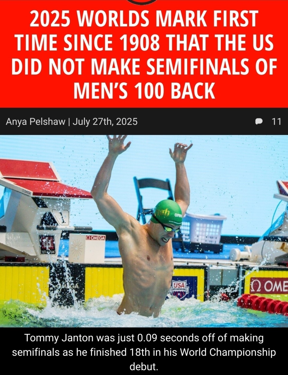 2025世界游泳锦标赛游泳项目第二个比赛日上午场比赛结束,美国队迎来自1908年以来,首次没有选手晋级男子100米仰泳半决赛尴尬局面。