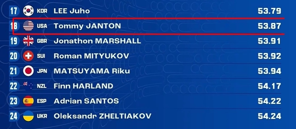 预赛结束后,杨顿排在第18位;艾金斯尴尬的排在第44位,双双无缘半决赛!