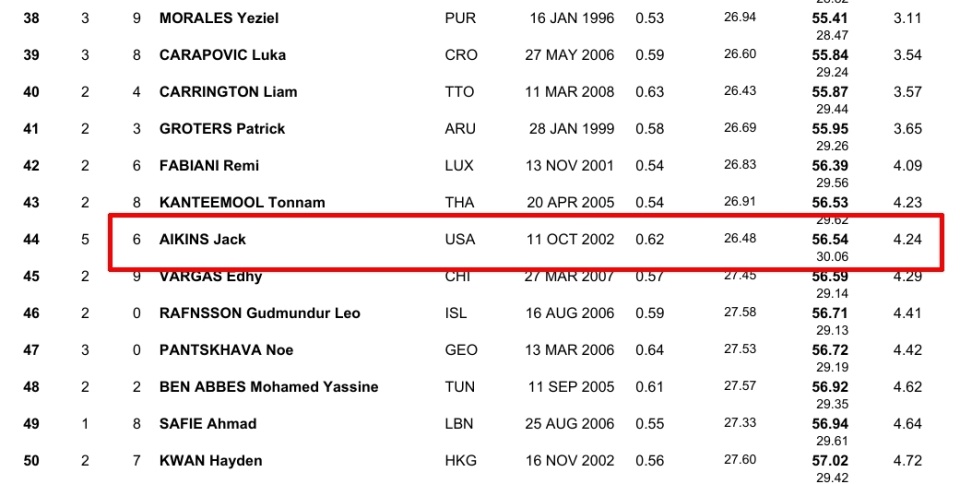 对于杰克.艾金斯56秒54,比预赛第一的法国选手布罗埃尔52秒30慢足足4.24秒的糟糕状态,他们还是给出了艾金斯是此前在泰国遭遇食物中毒运动员之一的理由。