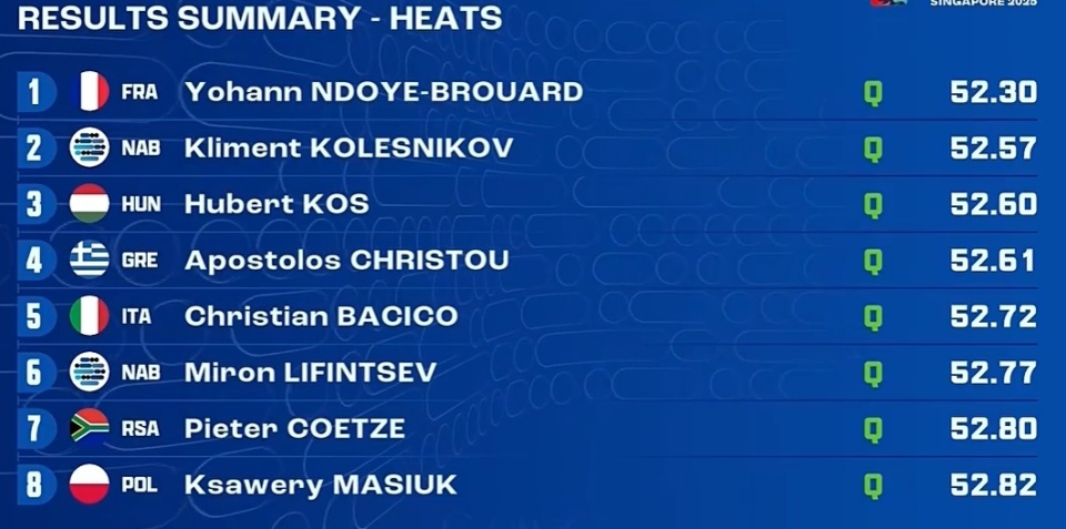 杨顿的情况也好不到哪里去,他始终在5-7名之间徘徊,最终以53秒87排在小组第六。