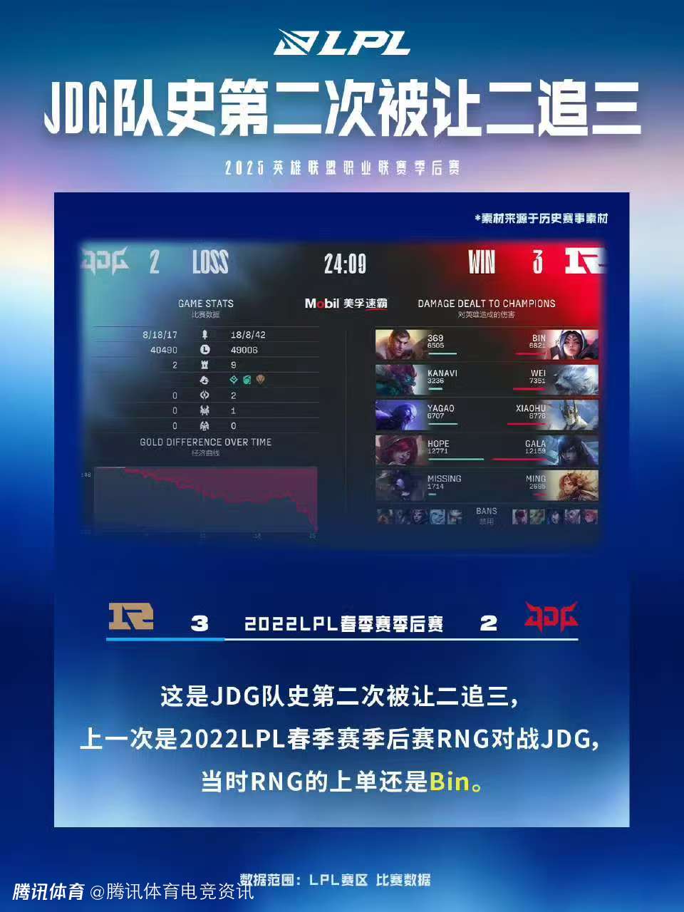 同时,这是JDG队史第二次被让二追三,上一次是2022LPL春季赛季后赛RNG对战JDG,当时RNG的上单还是@Bin哥厉害 。