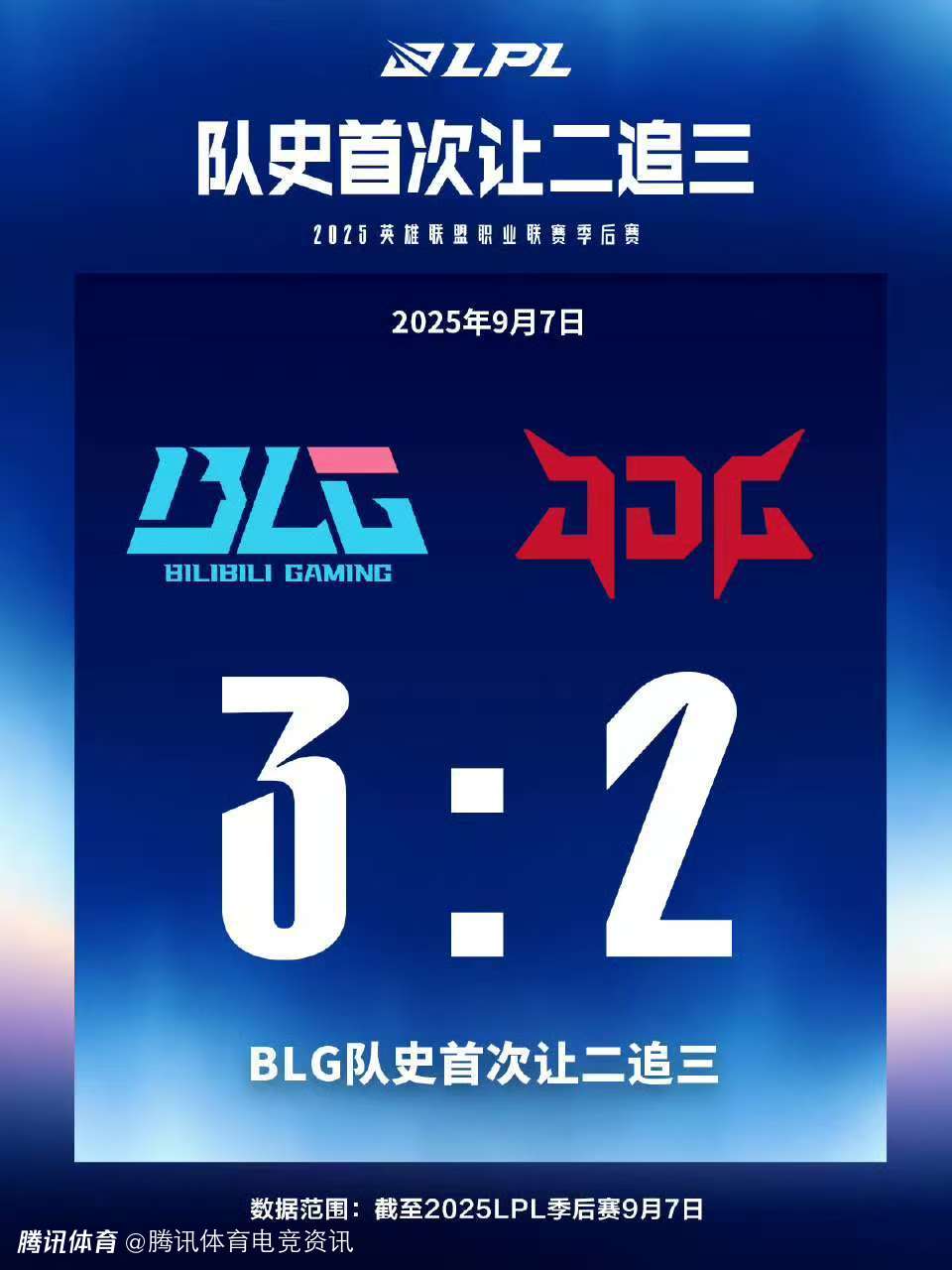 9月7日 LPL 季后赛BLG对战JDG,BLG赢下比赛后,达成了队史首次让二追三的成就,恭喜BLG让二追三晋级胜者组!