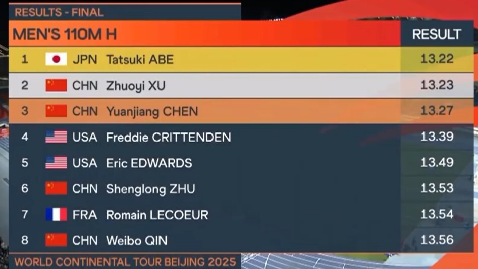 日本选手阿部竜希以13秒22获得了冠军,徐卓一13秒23的成绩获得亚军,小将陈圆将以13秒27的成绩获得季军,另外两位中国选手朱胜龙和秦伟搏,以13秒53和13秒56获得了第6和第8名。