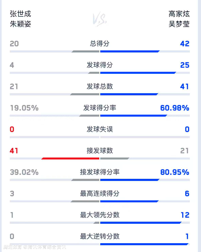 双方技术统计如下(高家炫/吴梦莹在前):总得分42-20、发球得分25-4、发球得分率60.98%-19.05%。