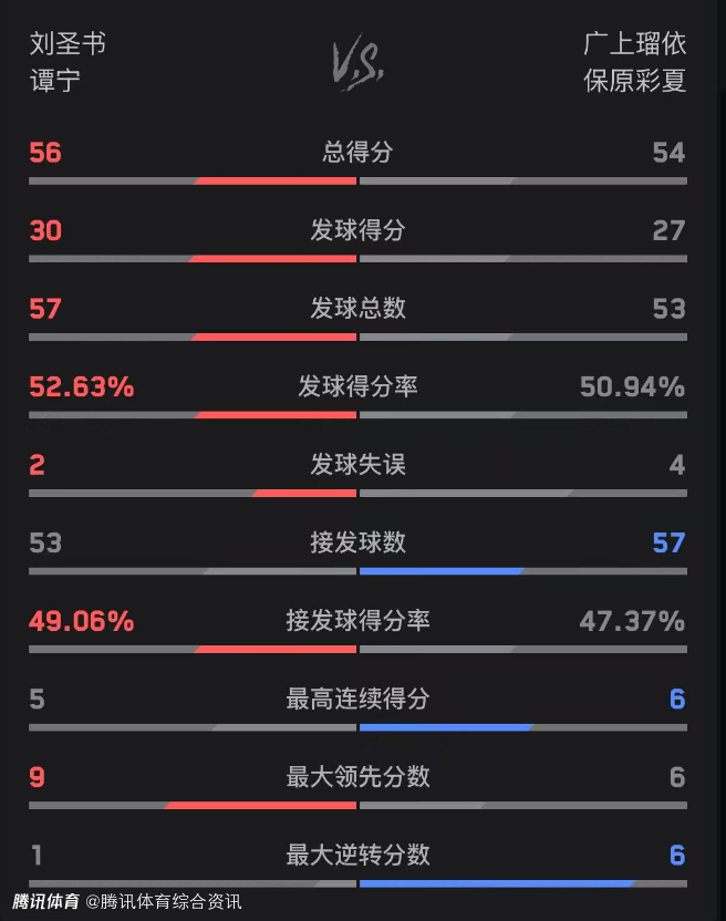 双方技术统计如下(圣坛组合在前):总得分56-54、发球得分30-27、发球得分率52.63%-50.94%。