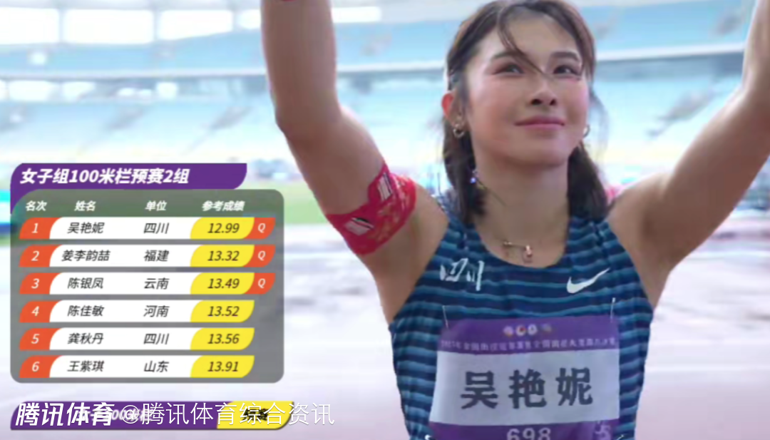 北京时间9月27日,2025年全国田径冠军赛暨全国田径大奖赛总决赛女子100米栏预赛,吴艳妮12秒99晋级决赛,林雨薇、夏思凝、陈银凤等名将也顺利晋级决赛,决赛将在9月28日晚9点10分进行。
