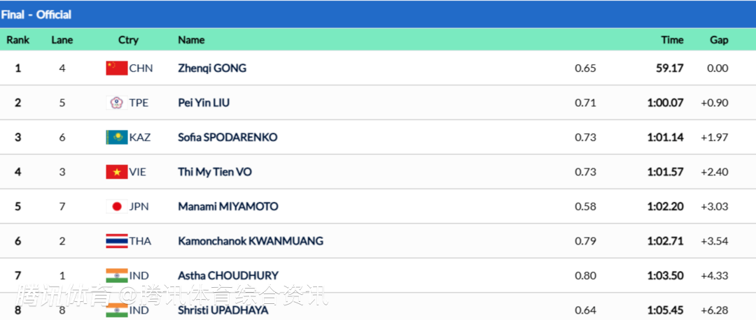此前的预赛,龚真琦游出1分01秒69的成绩,排名第一晋级决赛。决赛中,龚真琦继续保持火热的状态,最终以59秒17的成绩,成功夺金。前不久的世界青年游泳锦标赛,龚真琦和严窕珊、罗名钰、杨佩琪合作,以7:51.59夺得女子4×200米自由泳接力金牌,为中国队首夺世青赛接力项目冠军,距离赛会纪录仅差0.12秒。