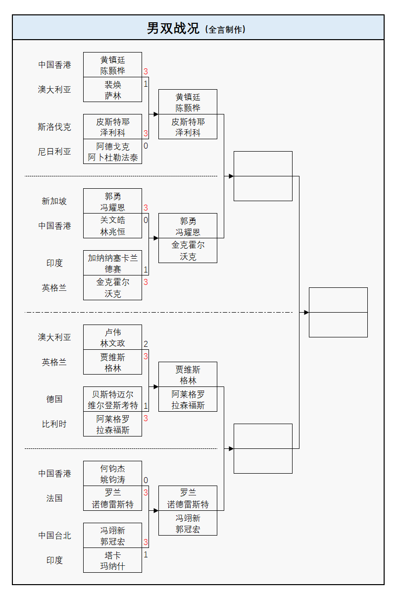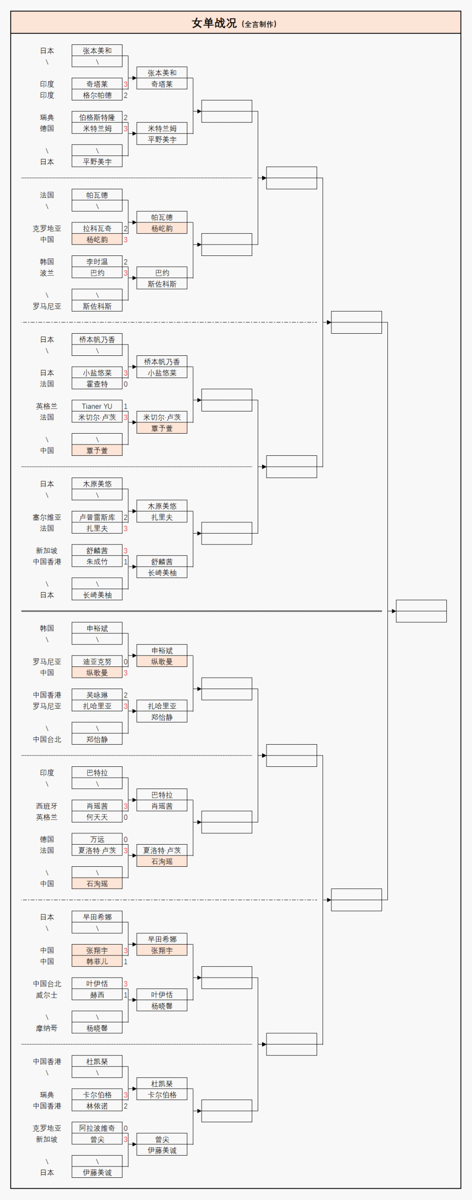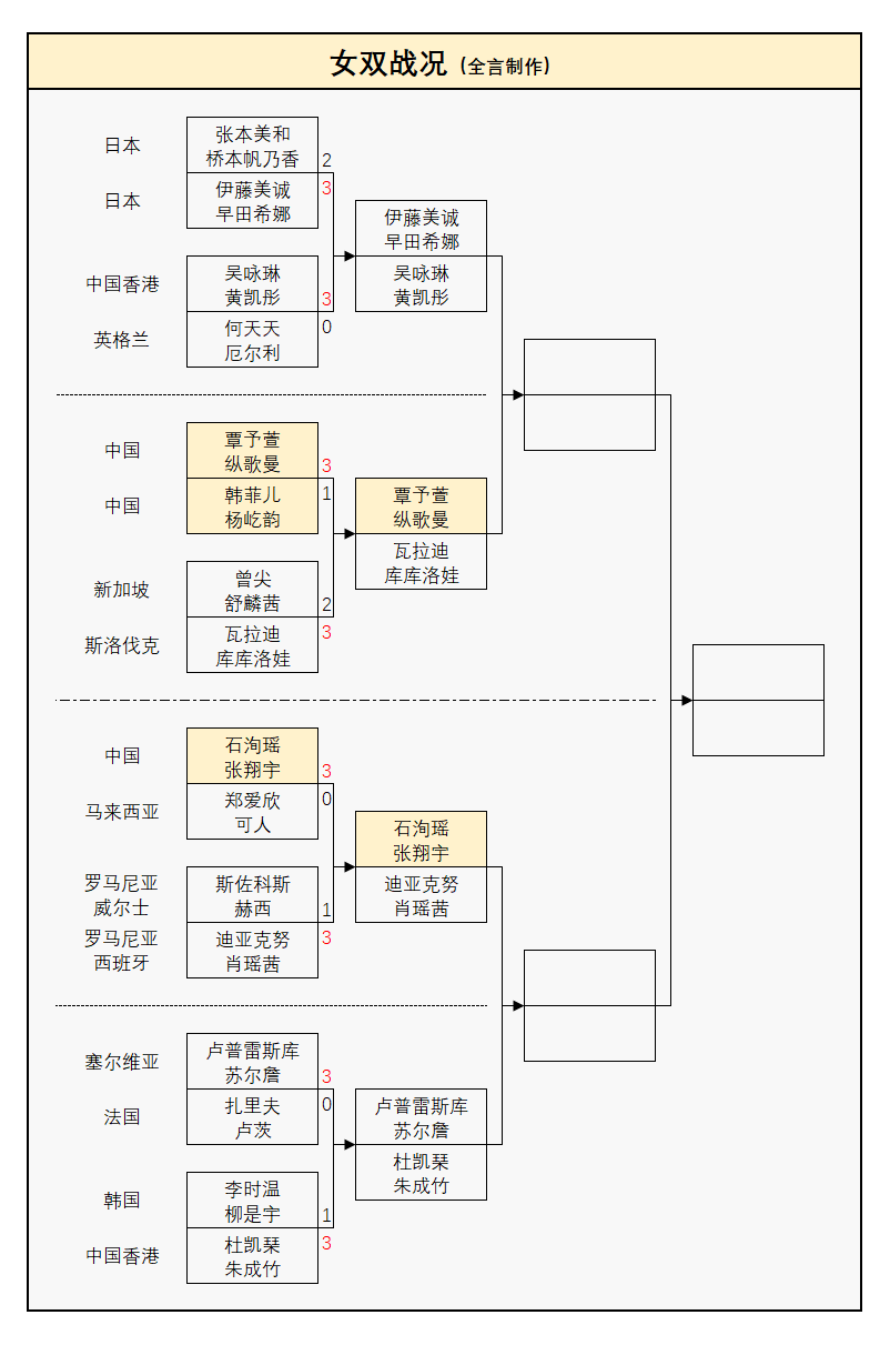 女双:覃予萱/纵歌曼3-1韩菲儿/杨屹韵、石洵瑶/张翔宇3-0郑爱欣/可人(马来西亚)。
