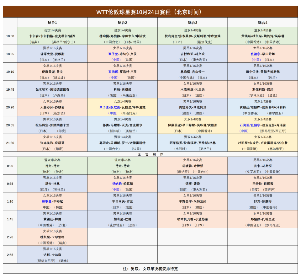 18:35,张翔宇VS早田希娜(日本)、覃予萱VS米切尔·卢茨(法国);
