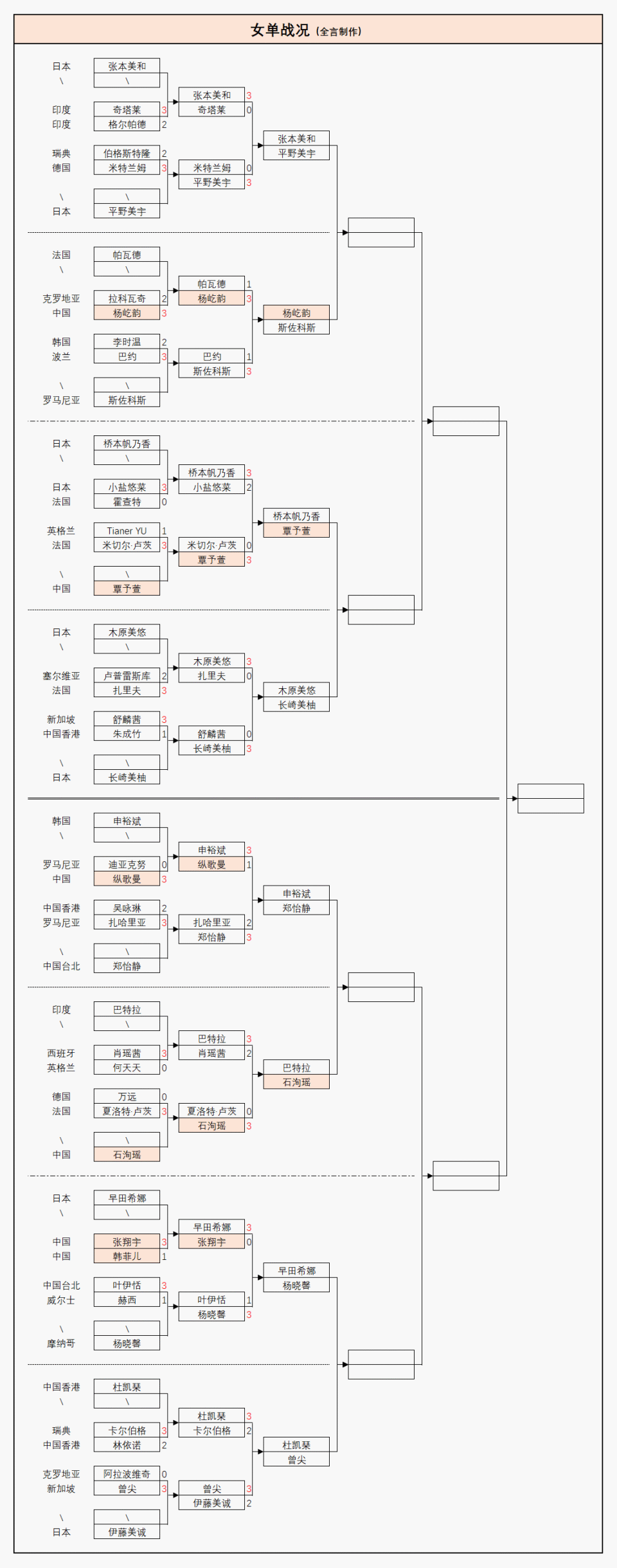 18:00,覃予萱VS桥本帆乃香(日本)、石洵瑶VS巴特拉(印度);