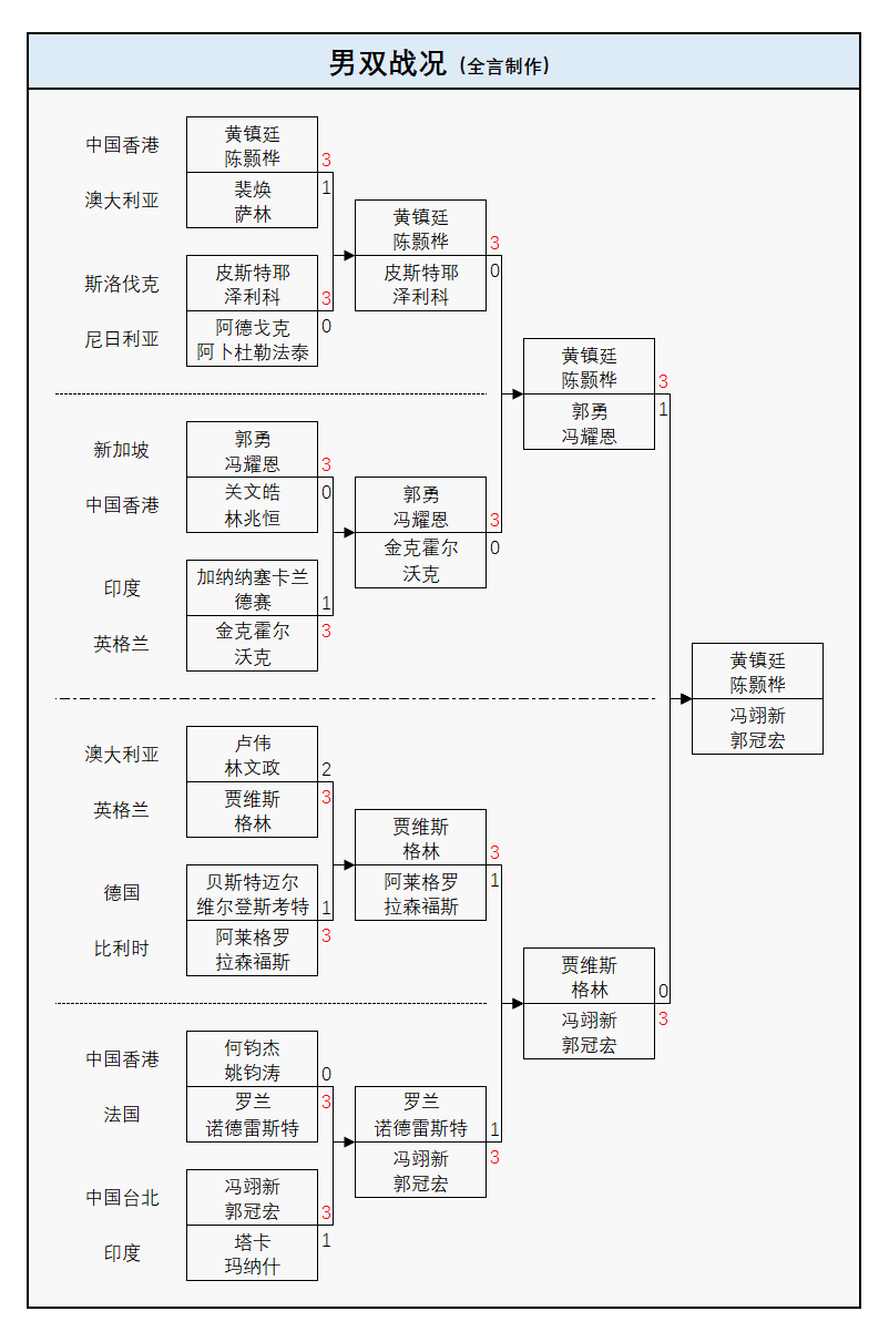 男双虽然没有国乒选手参与,但也是中国运动员会师决赛,对阵双方分别是中国香港的黄镇廷/陈颢桦、中国台北的冯翊新/郭冠宏,此外混双也是这两支球队的运动员争夺冠军,不过决赛被安排在后一天开打,那就让我们先静观第五个比赛日的对决结果出炉吧!