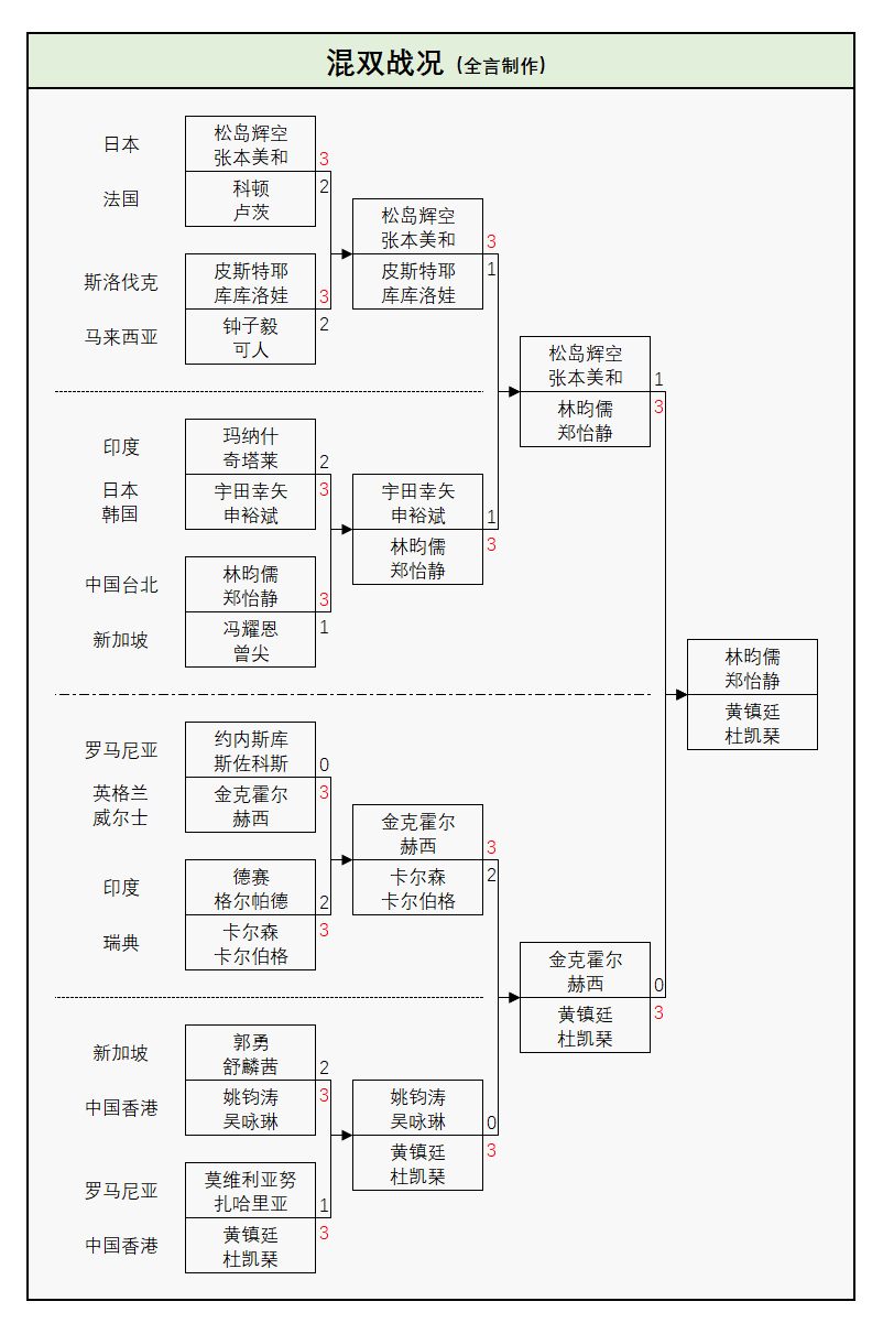 至于张本智和、桥本帆乃香、郑怡静、杜凯琹等名将都是3-2惊险晋级,张本美和女单速胜但女双、混双均已出局,伊藤美诚已结束本站比赛之旅,以下为五大项目的最新战况: