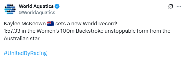 在韦斯特蒙特站赛事之前,该项目世界纪录为1分58秒04,由雷根-史密斯于去年12月的2024年短池游泳世界杯创下。