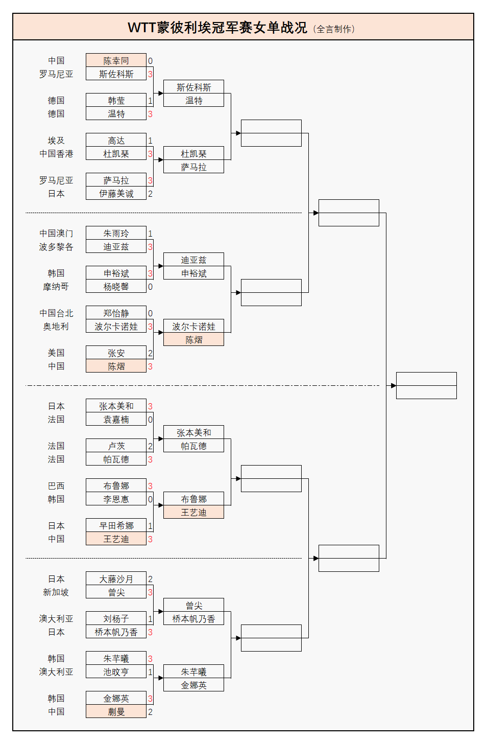 韩国3人:金娜英3-2蒯曼(中国)、朱芊曦3-1池旼亨(澳大利亚)、申裕斌3-0杨晓馨(摩纳哥);