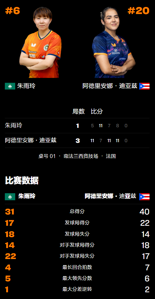 比赛开始后,朱雨玲很快便在首局打出了自己的精密控制与防守反攻能力,随即取得领先优势,不过随后迪亚兹开始增加发球的旋转与相持的速度压制老将追至4-4平,紧接着朱雨玲连丢5分状态全无,紧接着5-10未能挽救局点,最终以5-11败北先丢一城。