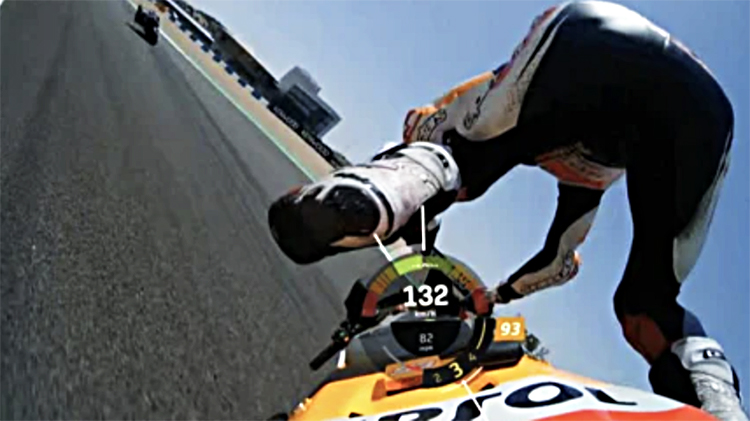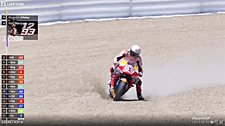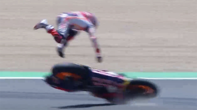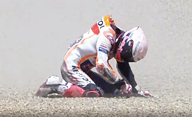 可是马奎斯不同意这种明哲保身的比赛态度,他还要拼命去追,并不肯放慢节奏,等待最好的超车时机。三号弯一出来,后轮再次摆动,性能优异的本田也倒了。卫冕冠军被挑到空中,落地时右小臂先摔在赛道上,就在他连续向前翻滚之际,后背又被追来的无人驾驶机车怼了一下,好在这之后的翻滚都是在陶滩上进行,没有受到更大的二次伤害。