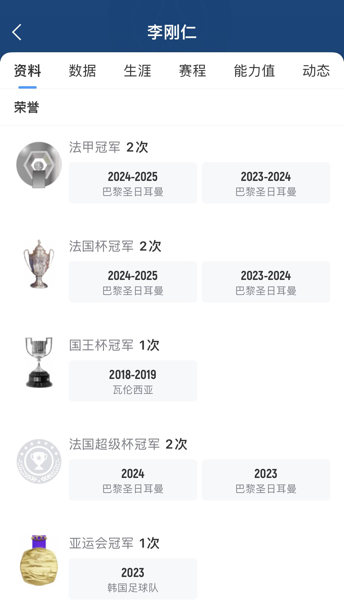 李刚仁2023年夏窗转会巴黎后,已跟随巴黎获得6冠,加上在瓦伦西亚获得的国王杯,他的俱乐部生涯已经有7座冠军。