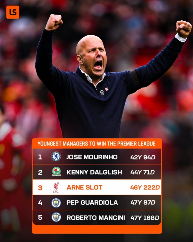 北京时间5月25日讯 据LiveScore统计,利物浦主帅斯洛特是英超历史上第三年轻的冠军教练。