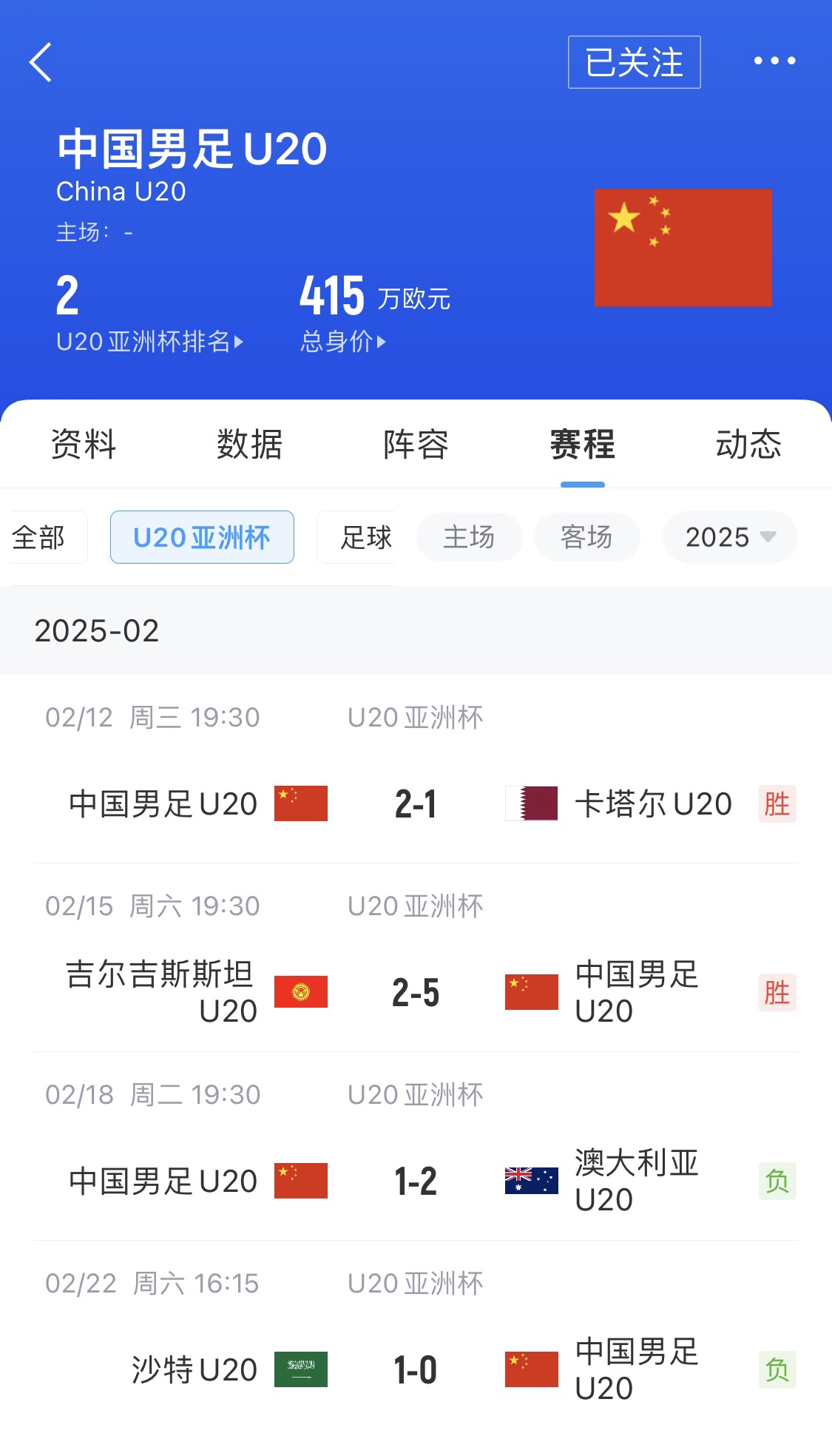 U20亚洲杯今年2月在深圳进行,U20国足小组赛分别2-1卡塔尔、5-2吉尔吉斯斯坦、1-2澳大利亚,以小组第二出线,1/4决赛0-1遭沙特绝杀,无缘世青赛。