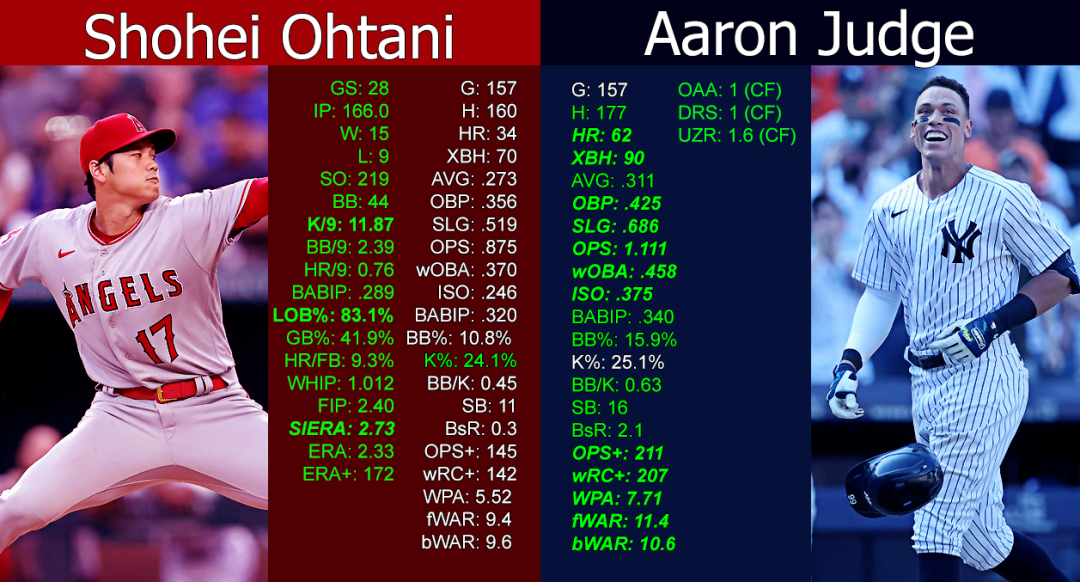 2022赛季大谷翔平和阿隆-贾奇数据对比(图片来源于网络)