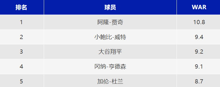 2024赛季联盟球员WAR前五位排名(数据来源于espn.com)