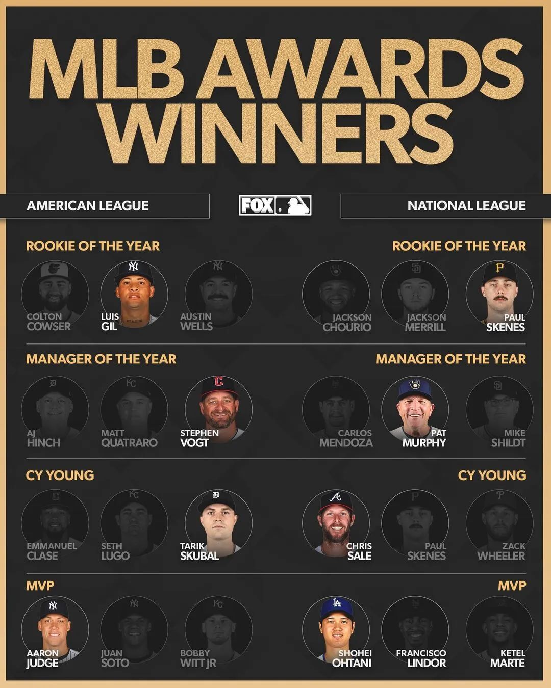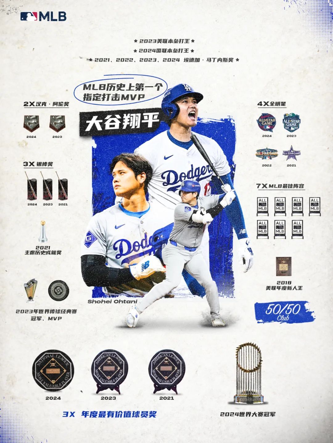 这是MLB历史上第二次两大联盟MVP同获满票,上一次正是在去年——勇士的小罗纳德-阿库尼亚(Ronald Acuña Jr.)手握40轰+70偷的傲人成绩,尚在天使的大谷翔平亦凭二刀流表现独领风骚。今年的“法官”可谓多点开花,本垒打(58支)、攻击指数(1.159)、胜利贡献值(10.8)均位列全联盟第一,近三年第二次获得MVP称号。大谷更是在50轰+50偷的成就达成后,和球队一起登上了世界冠军宝座。