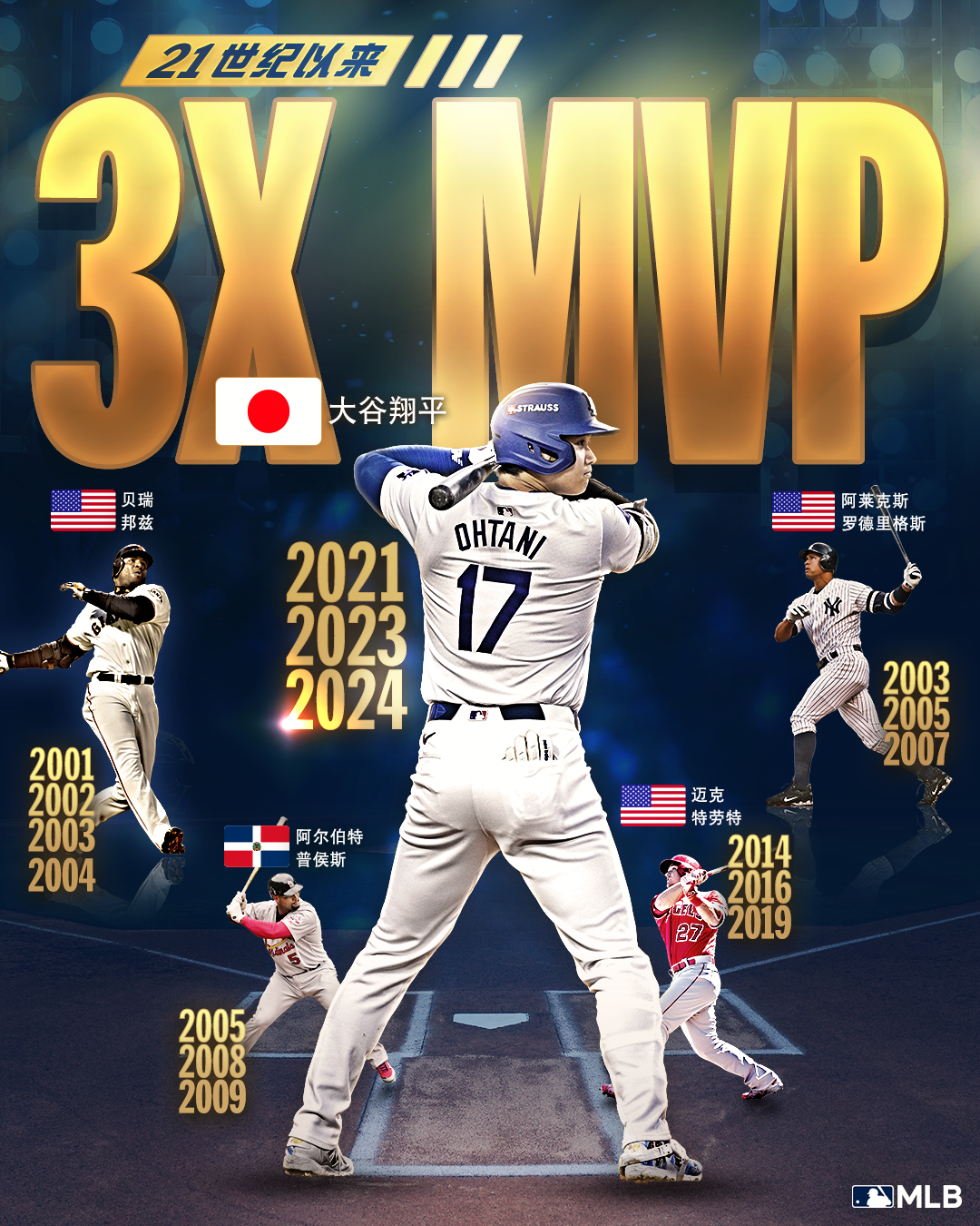 这还没完,历史上一共有20位全票MVP,大谷是第一位两次全票通过的MVP,现在他将这个纪录刷新到了三次。想要拿到三届MVP已经是非常困难,还要三次都全票更是难上加难。