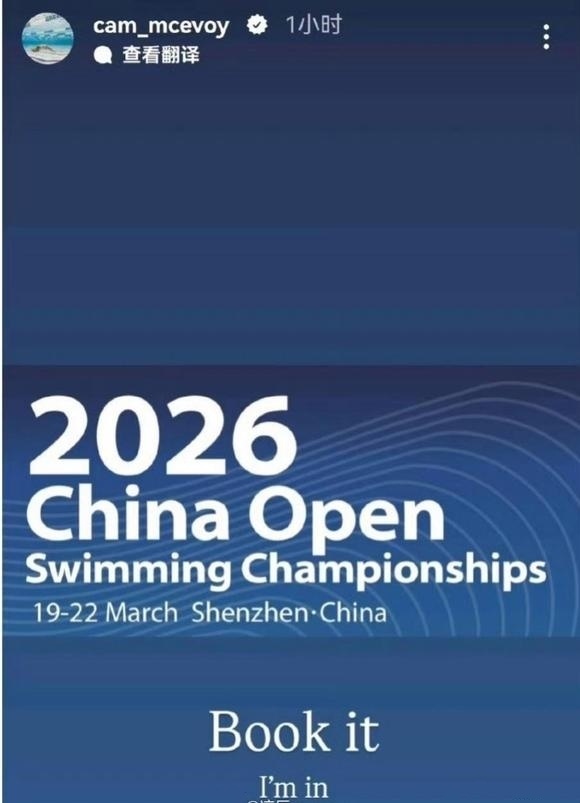 无独有偶,巴黎奥运会男子50米自由泳金牌、澳大利亚名将卡梅隆.麦克沃伊在一周前也发布了一张3月份中国公开赛的状态图,最下方还有“预定这场赛事,我要参加”的字样。