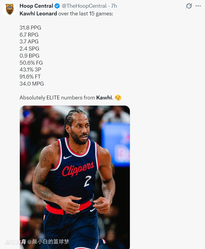自12月20日以来小卡出战了15场比赛(缺席了三场),他场均达到32.1分联盟第一,这期间快船18场比赛赢下了其中的15场比赛,快船期间的战绩也是联盟第一。