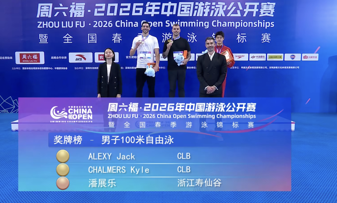 3月21日晚,2026年中国游泳公开赛暨全国春季游泳锦标赛在深圳大运中心游泳馆进行了万众瞩目的男子100米自由泳决赛。澳大利亚名将凯尔·查尔莫斯与美国选手杰克·阿莱克西以47秒70的相同成绩同时触壁,并列获得冠军;世界纪录保持者、巴黎奥运会金牌得主潘展乐以48秒05完赛,获得季军。