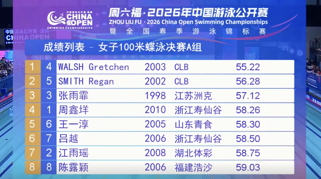 2026年3月21日晚,中国游泳公开赛第三比赛日在深圳大运中心游泳馆继续进行。女子100米蝶泳决赛A组,美国选手格蕾琴·沃尔什以55秒22强势夺冠,队友里根·史密斯56秒28获得银牌,中国名将张雨霏以57秒12摘得铜牌。
