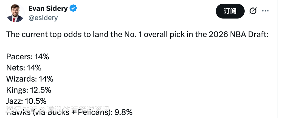 北京时间3月28日,据美记Evan Sidery报道,目前各队获得26年NBA状元签的概率排名,步行者、篮网、奇才均为14%。