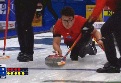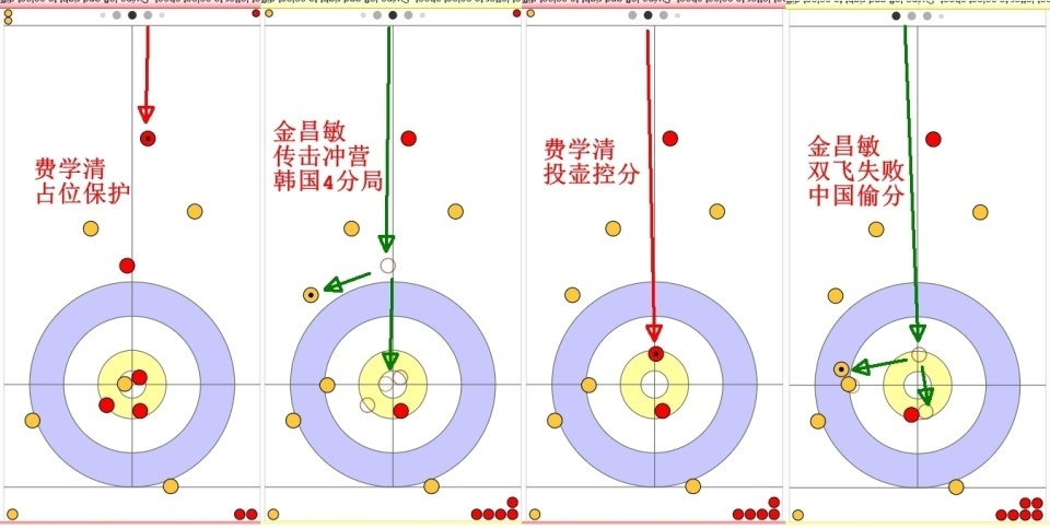 第三局:3分领先的中国队利用韩国队易失误的问题,清理占位后不断送壶入营,并击打韩国黄壶,始终不营造复杂局面,成功控分。