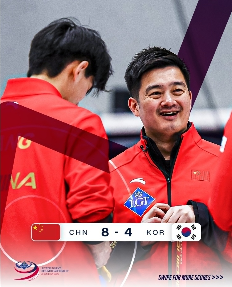 2026男子冰壶世锦赛结束了第十七轮的比拼:经历四连败的中国队,在与老对手韩国的交手里,以8-4力克对手,迎来第四场胜利。
