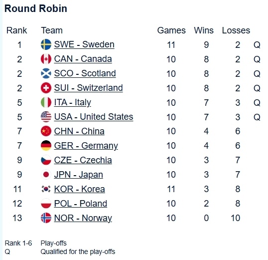 在上一轮,已经有6支队伍确定提前晋级季后赛,但因为循环赛没有比完,最终的排位还没有确定,17轮结束后是瑞典、加拿大、苏格兰、瑞士、意大利、美国。