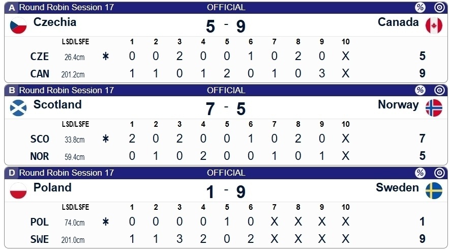 另外三场比拼里,捷克5-9加拿大、苏格兰7-5挪威、波兰1-9瑞典