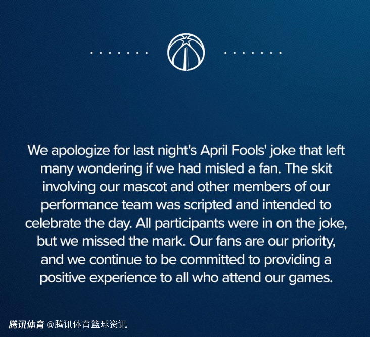 北京时间4月3日,奇才官方发布道歉声明,球队为愚人节的玩笑向大家致歉。