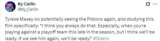 本赛季,活塞队在常规赛交手中已4-0横扫76人队。在谈到未来在季后赛中可能再次与活塞队对决时,马克西说道:“我认为你向来都会这么做。尤其是在赛季末段对阵一支季后赛级别的球队时,不过我觉得我们会做好准备。如果我们再次相遇,我们会严阵以待。”