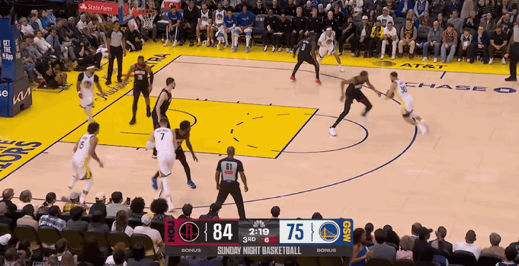 杜兰特通过错位防守库里,库里选择直接加速一步过掉对手成功打进抛投,库里甚至得意地坐在赛场中抖肩庆祝。库里一人连得5分帮助勇士缩小分差到4分,但是勇士没能阻挡申京和杜兰特的连续回应,火箭仍然带着10分领先进入第四节。