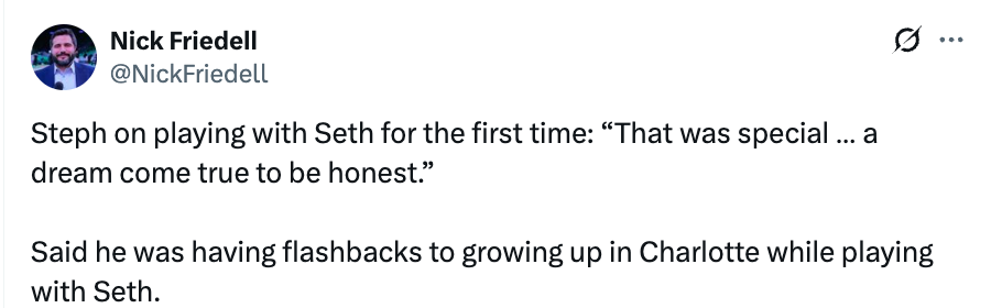 谈及自己和小库里一同打球,库里表示:“那一刻真的很特别,我们俩今年都过得特别不容易。我自己饱受伤病困扰,一度像个笑话,但我们是真正的兄弟。在一次暂停的时候,他走过来,那段瞬间让我瞬间闪回,想起了我们在高中一起打球的日子,仿佛一切又重新上演。