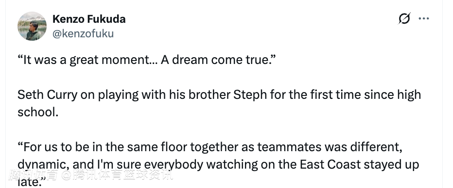 谈及自己得以和哥哥一同上场打球,小库里表示:“那真的是个美好的时刻,梦想成真了,对我们、对家人来说,这真的特别棒。”