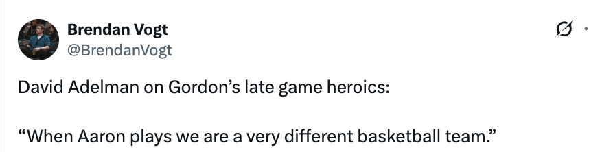谈及戈登末节的关键表现,小阿德尔曼表示:“当他上场时,我们完全就是另外一支球队。”此役戈登拿到23分9篮板5助攻,其中末节他拿到7分。