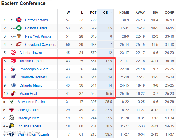 1-6名:活塞(57胜22负,锁定东部第一)、凯尔特人(53胜25负)、尼克斯(51胜28负)、骑士(50胜29负)、老鹰(45胜34负)和猛龙(43胜35负);按照目前排名,骑士首轮VS老鹰,尼克斯VS猛龙